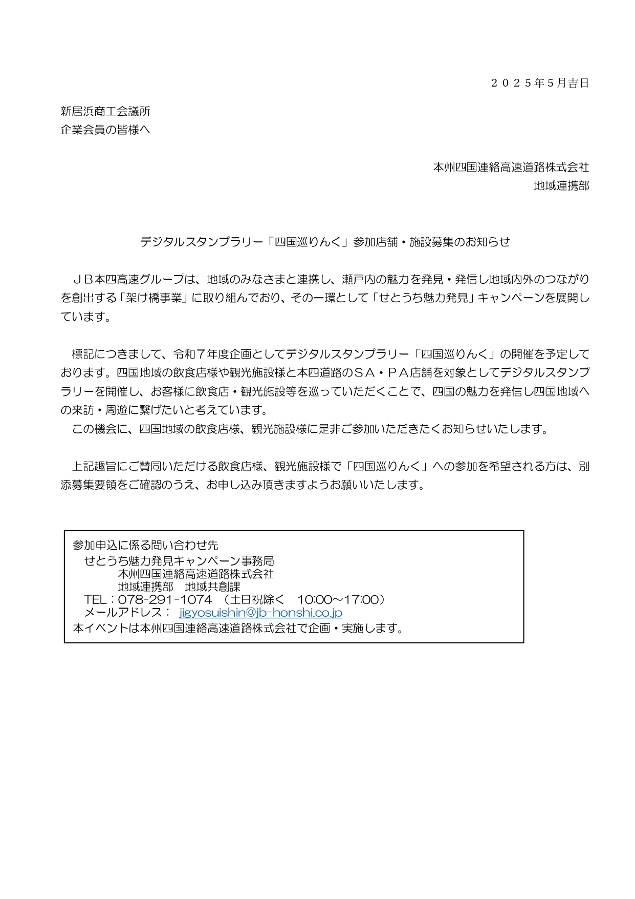 新居浜商工会議所 > お知らせ > 【当所会員の皆様へ/本州四国連絡高速道路からのお知らせ】デジタルスタンプラリー「四国巡りんく」参加店舗・施設募集のお知らせ