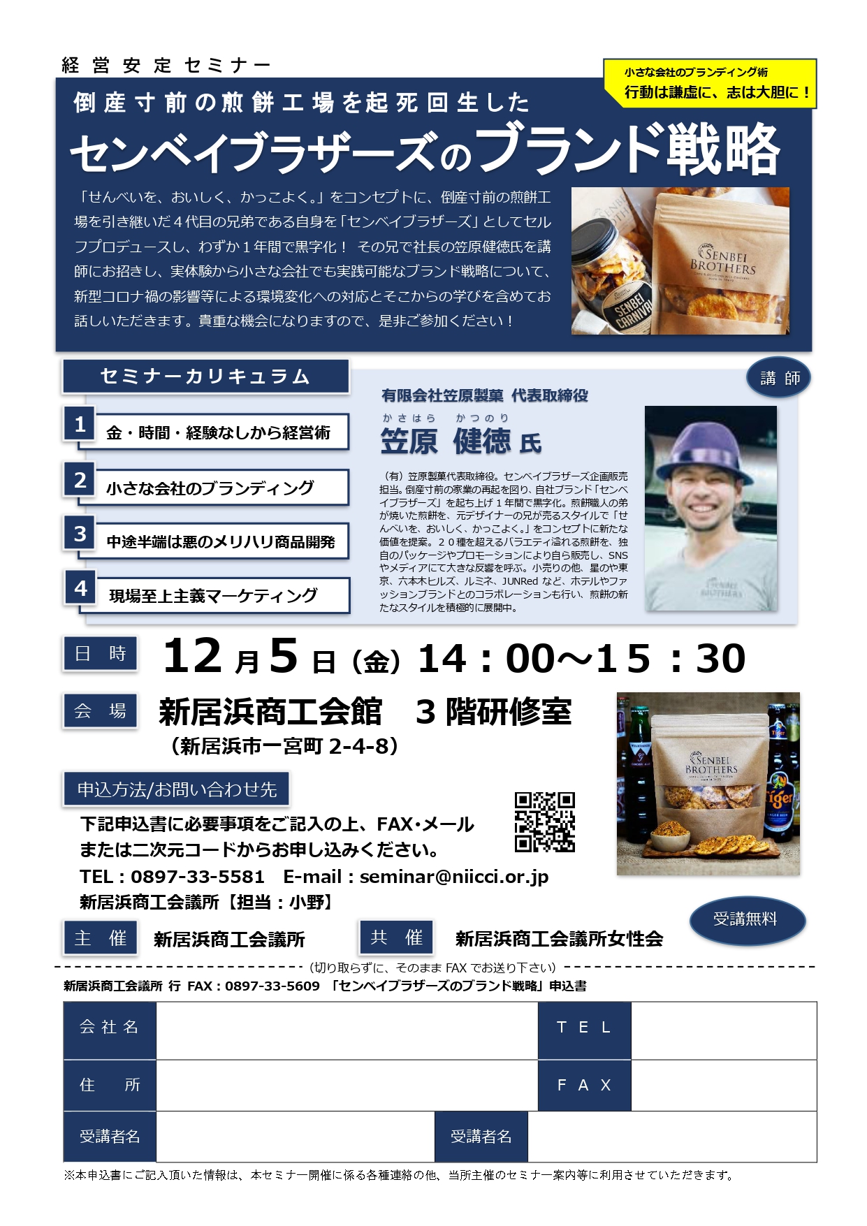 12/5開催の経営安定セミナー「倒産寸前の煎餅工場を起死回生したセンベイブラザーズのブランド戦略」のご案内